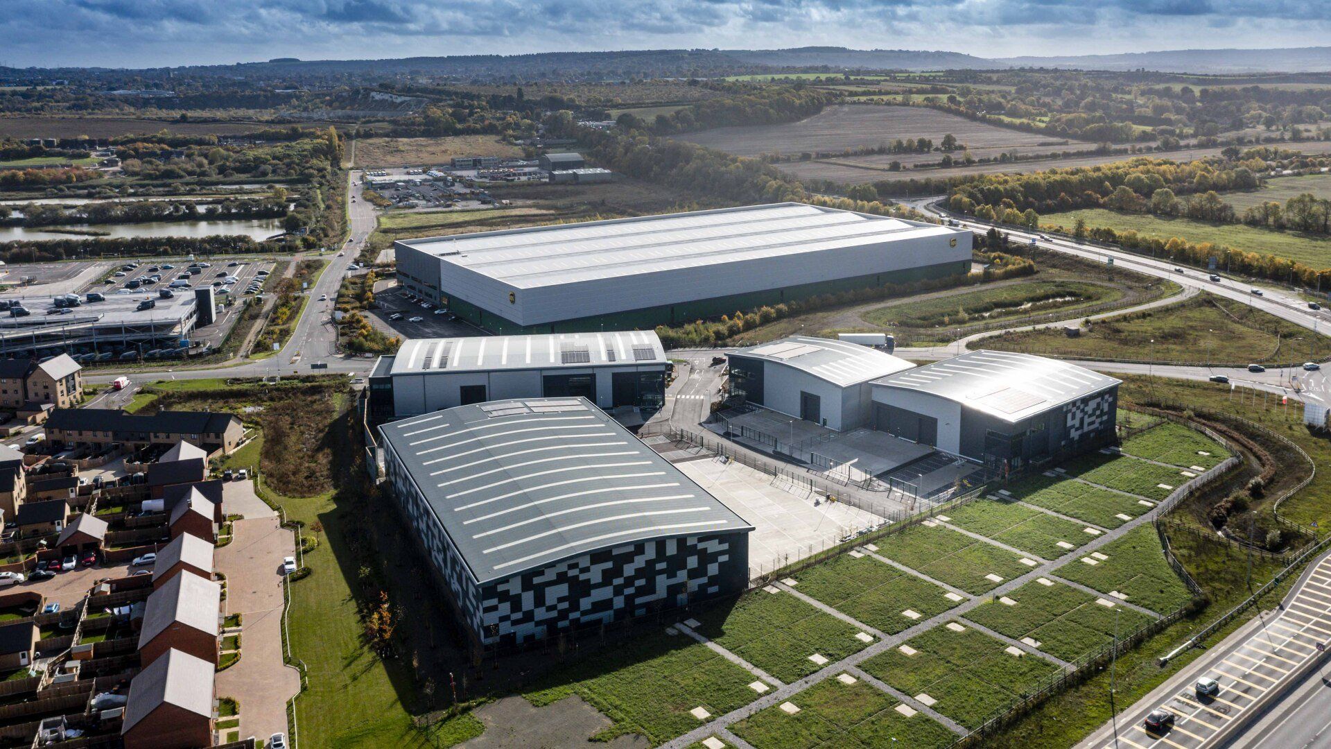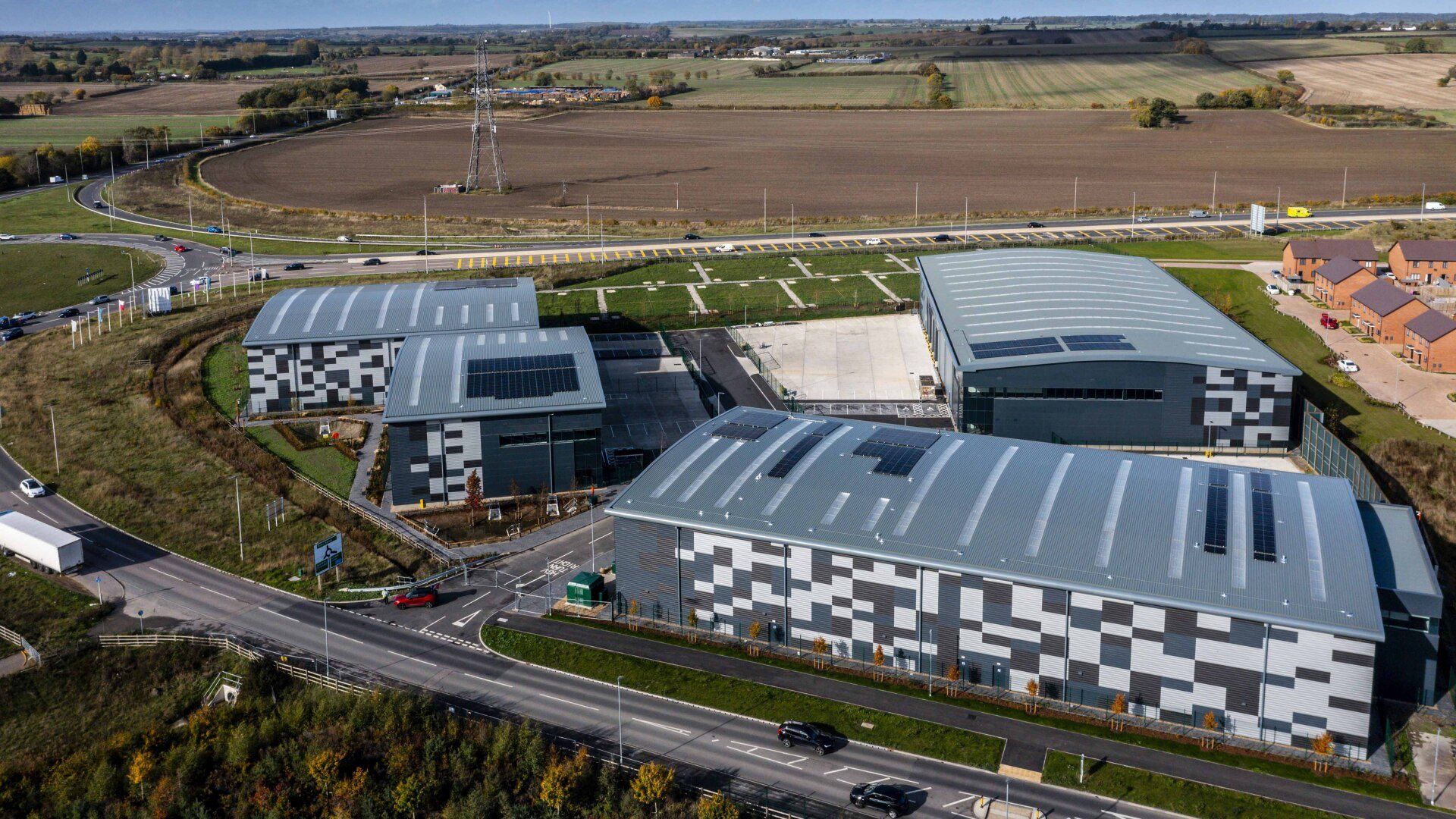 The buildings themselves are constructed with steel frames and a mixture of built up and composite cladding. The external works consist of concrete access roads, HGV yards and service areas, tarmac car parking bays with block paved footpaths.